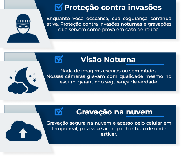 Sim. Nossas câmeras contam com visão noturna de alta qualidade, garantindo imagens nítidas mesmo no escuro.